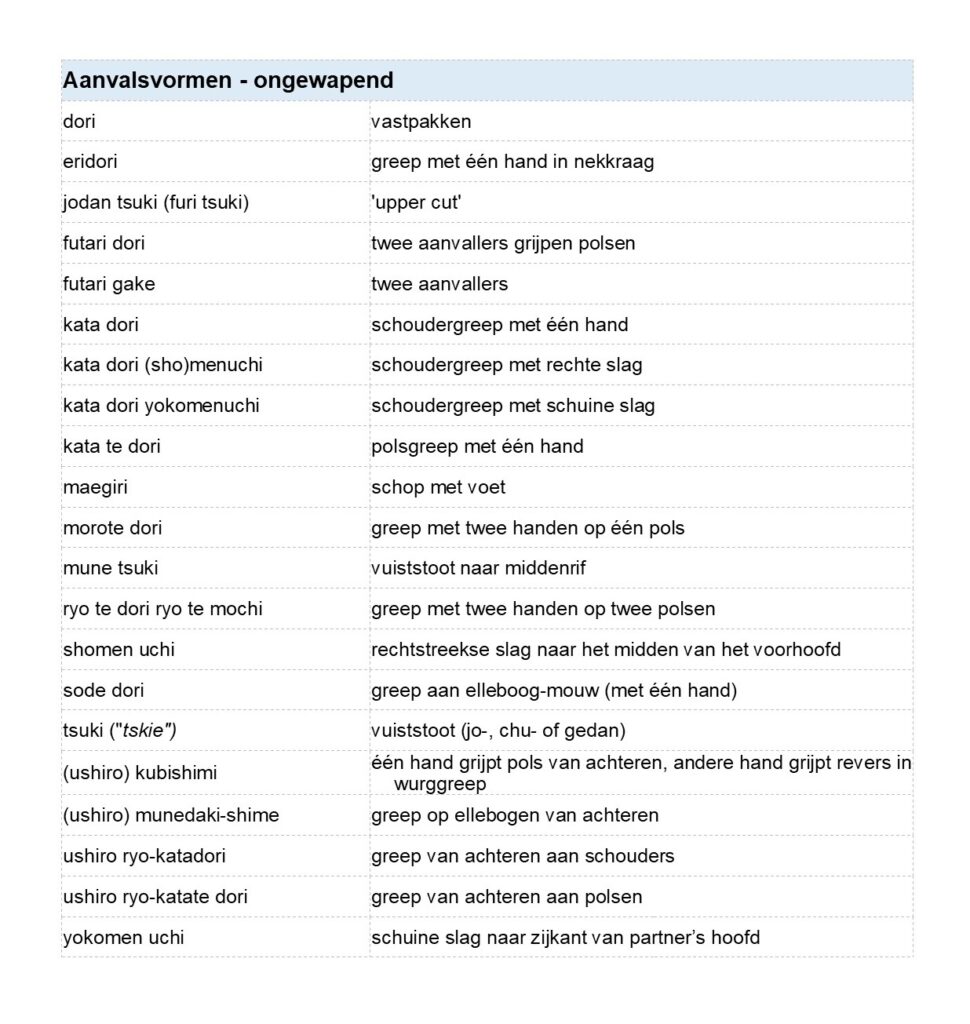 Aikido-termen 3 – Aanvalsvormen Terug naar Inhoud… Klik verder voor: Lichaamsdelen Basisstappen Basisbewegingen Valbreken (ukemi) Positie en richting Aikido-technieken – ongewapend Wapens Aanvalsvormen en technieken met wapens Basistermen in Aikido en andere krijgskunsten Martial Arts-systemen Algemene Japanse woorden Tellen in het Japans