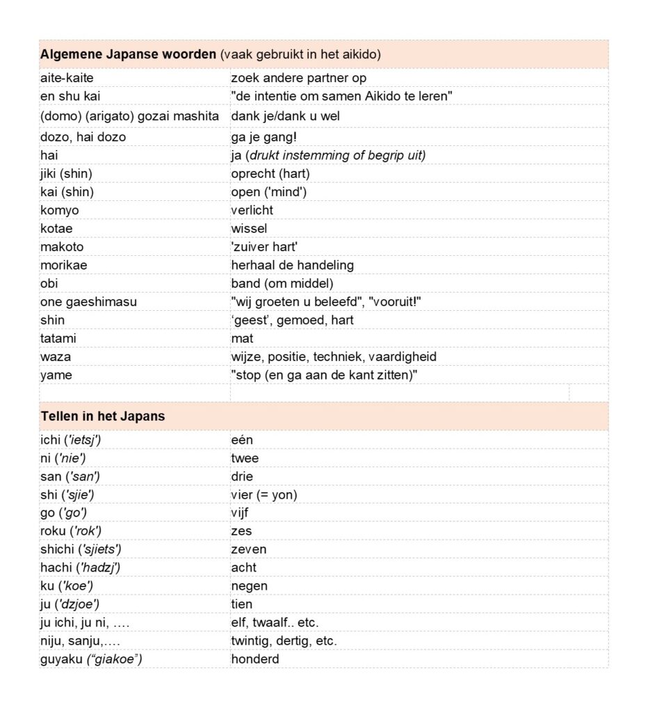 Aikido-termen 8 – Japans algemeen Terug naar Inhoud… Klik verder voor: Lichaamsdelen Basisstappen Basisbewegingen Valbreken (ukemi) Positie en richting Aanvalsvormen – ongewapend Aikido-technieken – ongewapend Wapens Aanvalsvormen en technieken met wapens Basistermen in Aikido en andere krijgskunsten Martial Arts-systemen Algemene Japanse woorden Tellen in het Japans