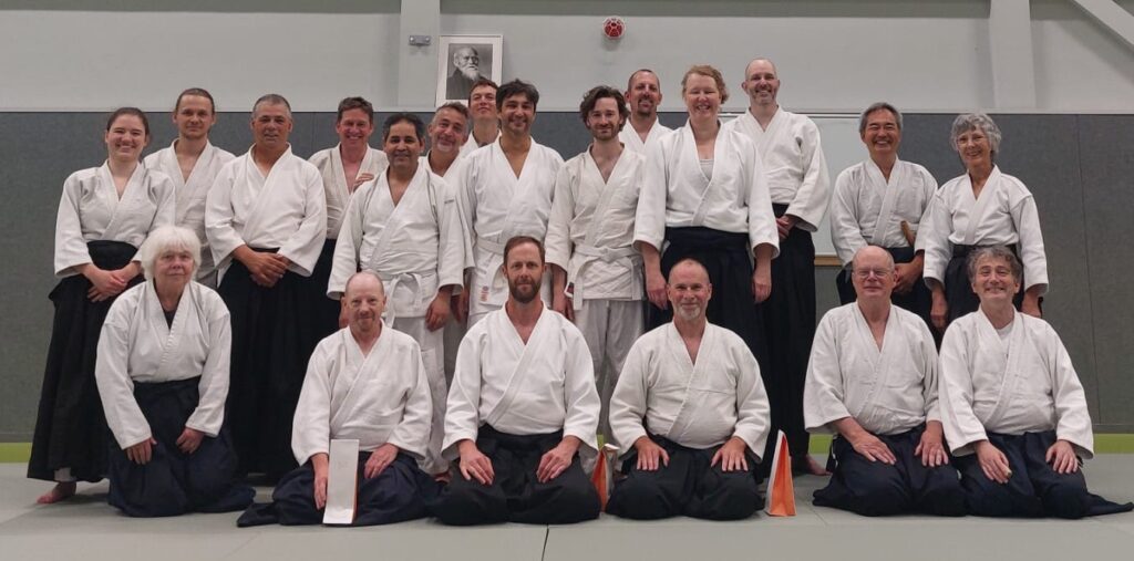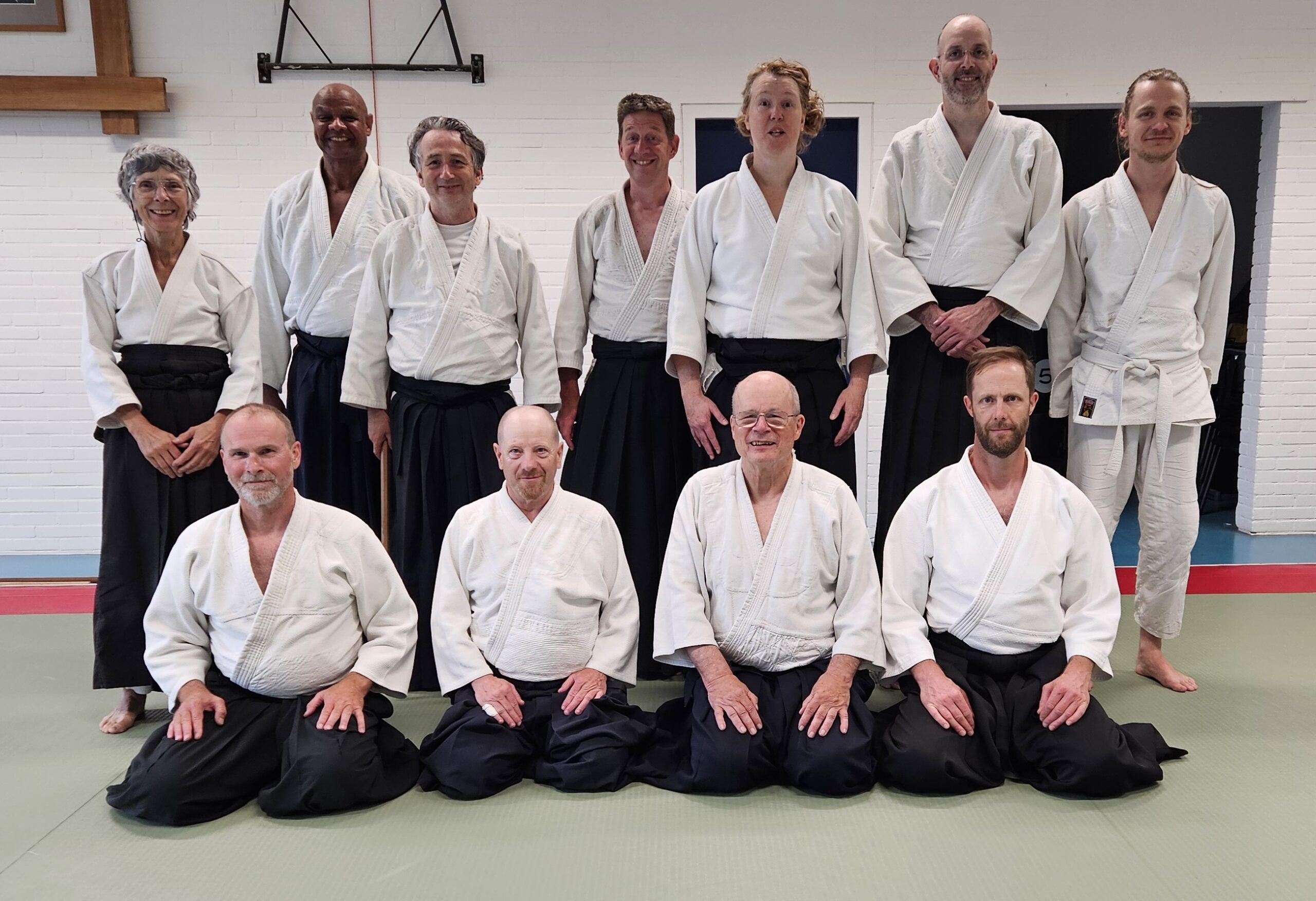 Op 24 en 25 mei hielden we weer een Lenteschool met vier leraren: Jeremy Garmson (6e dan) en Martin Davies (5e dan) van Komyokan Dojo (UK), en Piet Lagerwaard (7e dan) en Philippe Notenboom (6e dan) van de AFN. Alle vier zijn leerlingen van wijlen Terry Ezra Shihan, en zijn gedachtengoed stond dan ook centraal. Vooral de effectieve werking van diepe ontspanning en centreren kwam aan de orde. Daarbij ging het niet alleen om instandhouding van de principes van Ezra’s aikido, maar ook om het zoeken naar nieuwe toepassingen. Zo werkte Jeremy bijvoorbeeld met tanto tegen bokken in onderdelen van de door Ezra ontwikkelde Kaishi-No-Kata. Martin liet zien met hoe veel kokyo-technieken je je partner subtiel uit balans kon brengen. Philippe herinnerde ons aan het werken vanuit de heupen en naar beneden ‘spiraleren’ van je lijf. Piet wees op het belang van de zwaartekracht en het ‘gewicht aan de onderkant’. En zo veel meer! We kunnen weer volop vooruit.