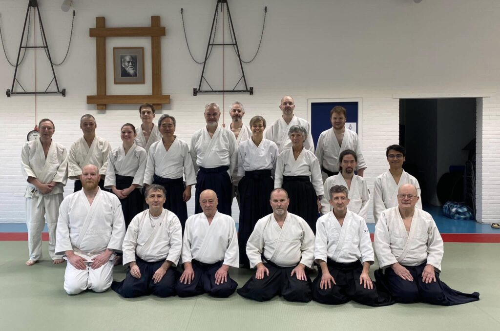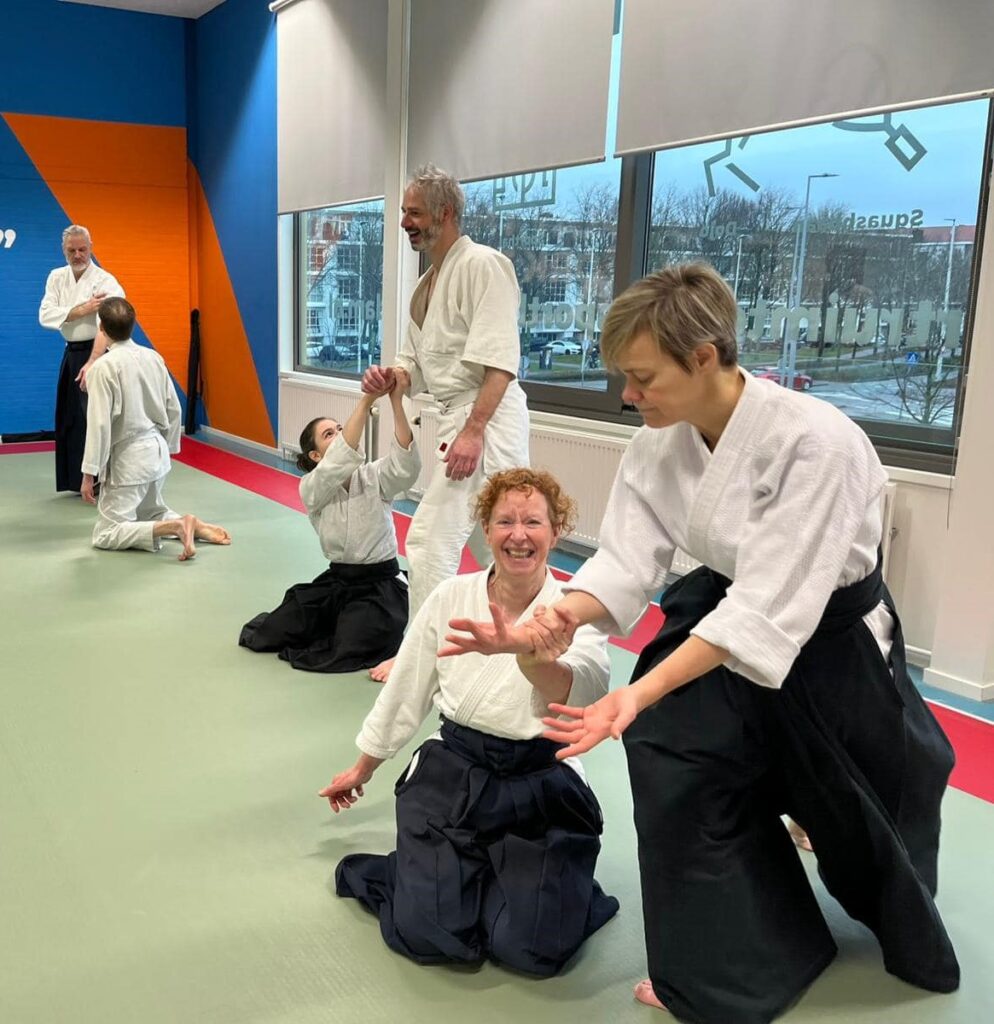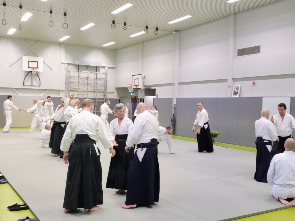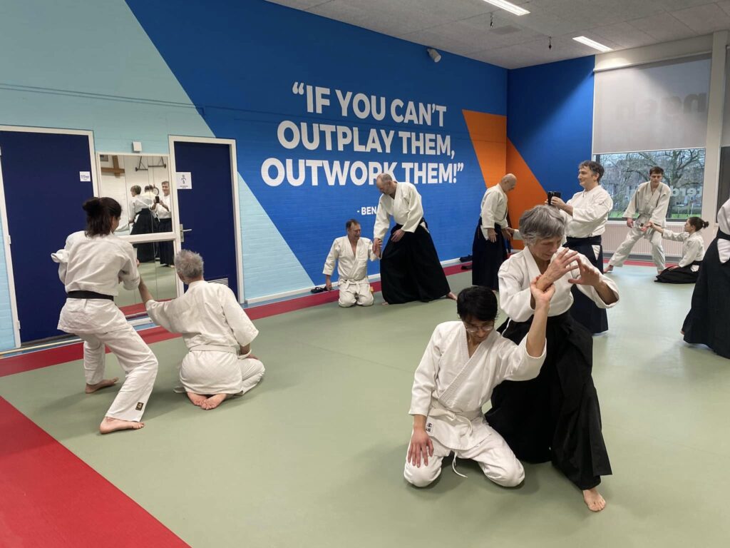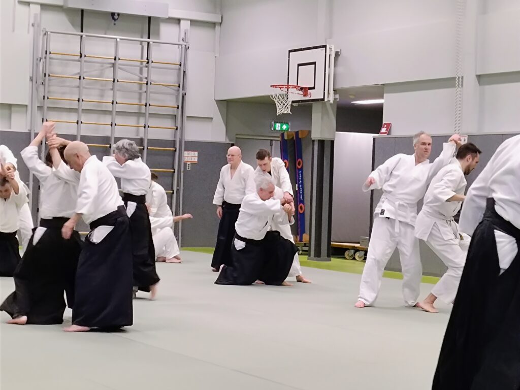 Gastdocent Nick Waites (7e dan) gaf lessen, samen met AFN-docenten Piet Lagerwaard (7e dan), Philippe Notenboom (6e dan). In Rotterdam had de club Aikido Rotterdam hun reguliere zaterdagles in Slaak 5 opgegeven voor onze stage en in ruil daarvoor trainden ze gratis met ons mee. Een leuke uitwisseling! De sfeer was op beide dagen vreugdevol en relaxed. Thema’s als musubi (dynamische beweging van tegengestelde krachten) en kyushu (balansverstoring) kwamen aan de orde. Nick onderwees onder andere ushiro sokumen, een taisabaki schuin naar achteren die tori snel in veiligheid brengt, ongeacht de aanvalsvorm. Ook bracht Nick zijn nieuwe kumijo (jo kata voor 2 personen) voor het voetlicht. Deze begint ogenschijnlijk eenvoudig, maar steekt ingewikkeld in elkaar door verschillende herhalingen in spiegelbeeld. Piet verdiepte het thema ontspanning: blijven we ontspannen in onze technieken, dan voelen we beter aan wat uke doet, en kunnen we daar ook beter op reageren. Philippe ging door op het thema balans, en sprak over omgaan met angst en spanning, zowel bij tori als bij uke. De twee nieuwe 5e danhouders, Ben Leung en Cathrien de Pater, zouden ook lesgeven, maar helaas had Ben griep. Cathrien gaf in Utrecht een les over shihonage-technieken uit verleden en heden. Al met al een waardevolle stage. Er was tijd om rustig de onderliggende principes van het aikido te beoefenen. Dat gaf verdieping in het beeld van aikido als budo, een mindset die je goed meekreeg door het onderwijs van de verschillende docenten gedurende deze dagen.